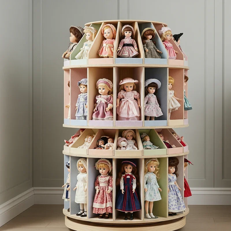 Spin your way to organization with a rotating carousel that makes every doll easily accessible! These turntable-style organizers fit in corners or on dresser tops, maximizing awkward spaces. Multiple tiers provide vertical storage without requiring reaching or climbing for access. The 360-degree rotation means kids can find specific dolls without disturbing others. Choose from wooden lazy Susan styles or modern plastic versions with compartments. Add small containers or dividers to each section for accessories and tiny dolls. The spinning motion adds playful element to cleanup time, encouraging participation. Position at child height on sturdy surfaces to promote independent play and cleaning. Some models include mirrors or decorative elements that enhance room décor. This space-saving solution typically holds 20-30 dolls in minimal square footage!