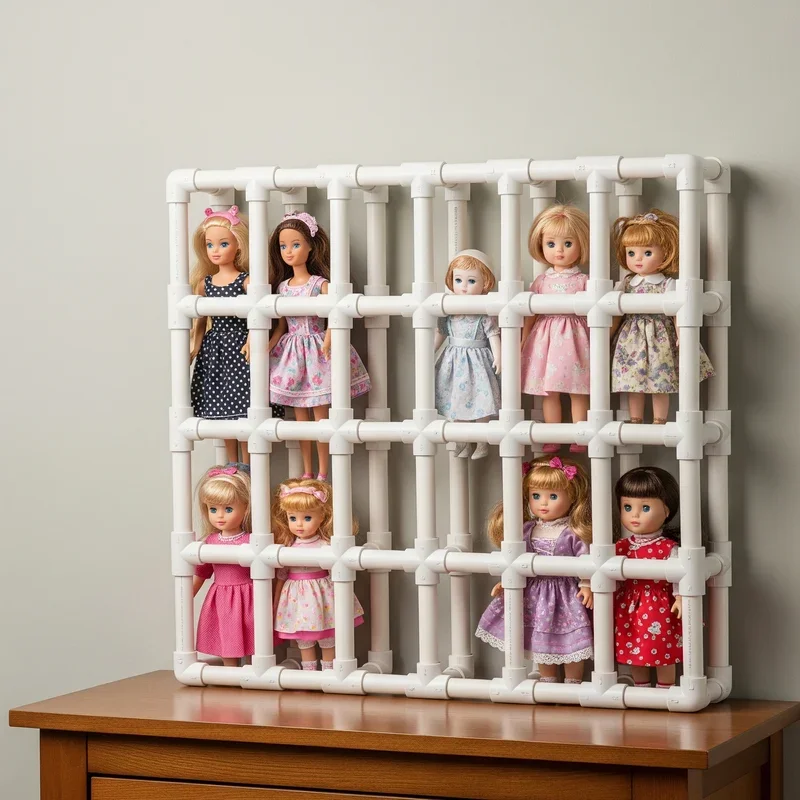 Engineer a custom storage solution using PVC pipes that creates individual "seats" for each doll! Cut pipes to doll-height lengths and connect with joints to create multi-level displays. The cylindrical openings hold dolls upright and organized like a specialized garage. Paint pipes in bright colors or wrap with decorative paper for appealing aesthetics. The lightweight construction allows easy reconfiguration as collections or room layouts change. Add end caps to create enclosed storage for smaller dolls or accessories. This unusual approach sparks conversations and adds industrial-chic elements to playrooms. Mount horizontally on walls or stand vertically in corners for space efficiency. The durable material withstands rough play and frequent handling by excited children. This entire system typically costs under $25 at hardware stores!
