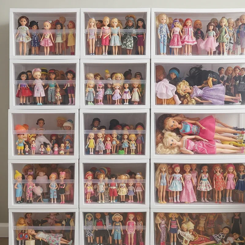 Stack your way to organization with transparent drawer units that make finding specific dolls effortless! These versatile units come in various sizes to fit any space, from closet floors to desktop surfaces. Each drawer becomes home to different doll categories: babies in one, fashion dolls in another. The see-through design eliminates guessing games while protecting dolls from dust and damage. Wheels on bottom units allow easy repositioning for cleaning or room rearrangement. Label drawers with pictures for pre-readers or words for older children learning organization skills. The modular nature means you can add drawers as collections grow over time. Use drawer dividers to create smaller compartments for accessories and tiny dolls. These affordable units often cost less than traditional furniture while offering superior visibility. Your child's entire collection becomes a organized, accessible treasure chest!