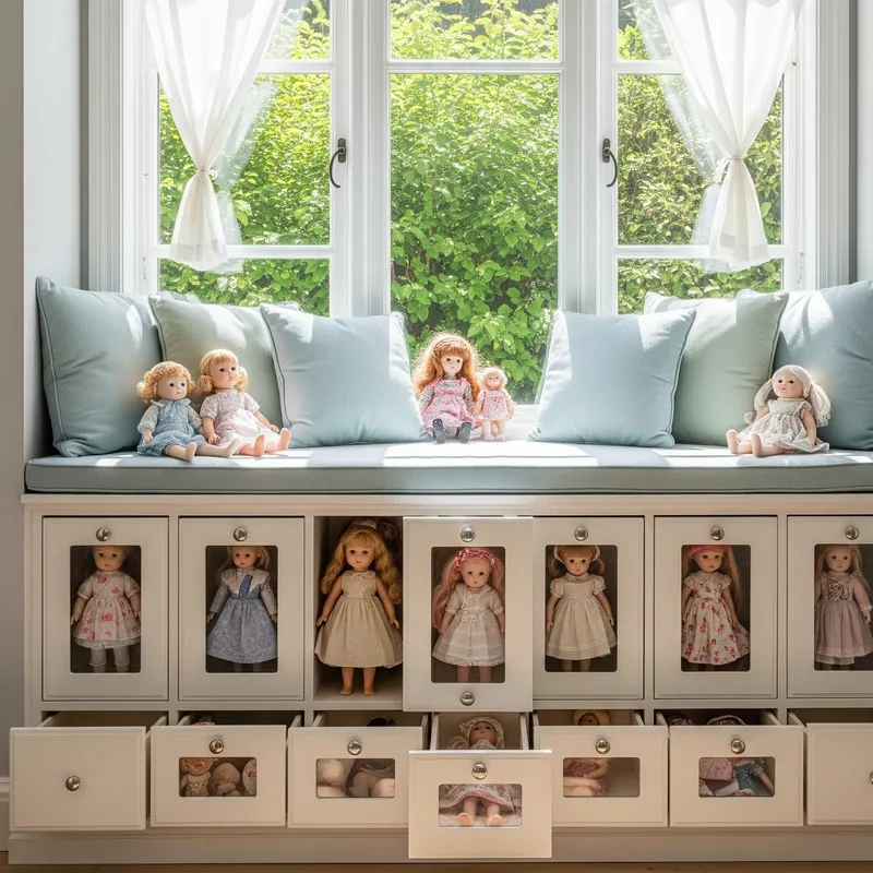 Maximize natural light and storage with a window seat that hides dolls while providing cozy reading spots! Built-in benches with lift-up tops offer deep storage for extensive doll collections. Add dividers inside to prevent dolls from jumbling together during opening and closing. The cushioned top becomes a perfect spot for playing with dolls in natural light. Include side cubbies or drawers for frequently accessed favorites or smaller accessories. This furniture piece adds significant home value while solving storage dilemmas beautifully. Use gas struts for safe lid operation that prevents finger-pinching accidents. The bench depth accommodates even large doll furniture and playsets when needed. Paint or stain to match existing room furniture for cohesive design. This solution transforms awkward window areas into functional, beautiful focal points!