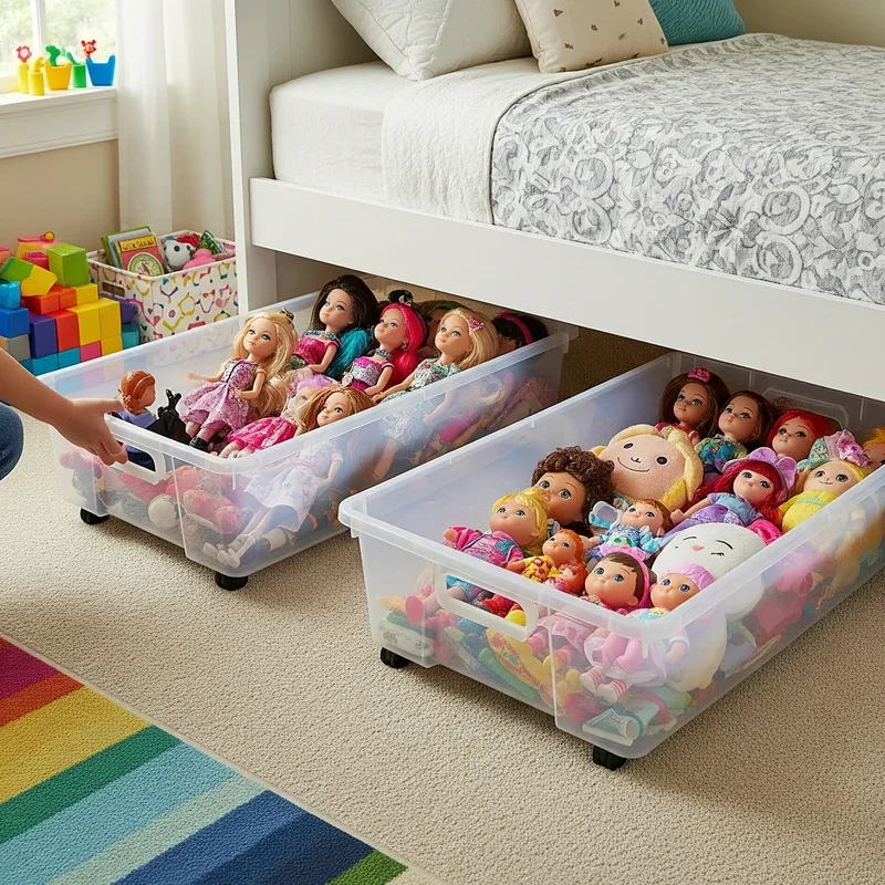 Maximize that forgotten space under the bed with rolling bins that slide out smoothly for playtime! These bins keep dolls protected from dust while remaining easily accessible for daily play. Choose clear containers so kids can identify contents without pulling everything out. The rolling feature means even young children can independently access and return their dolls. Divide larger bins with adjustable compartments to prevent dolls from becoming tangled together. Label bins by doll type, outfit categories, or individual child if siblings share rooms. The hidden storage maintains a clean room appearance while holding impressive doll quantities. Add sachets of lavender to keep dolls fresh-smelling and ward off any mustiness. Low-profile designs work even under bunk beds or daybeds with minimal clearance. This solution handles overflow collections without consuming visible room space!