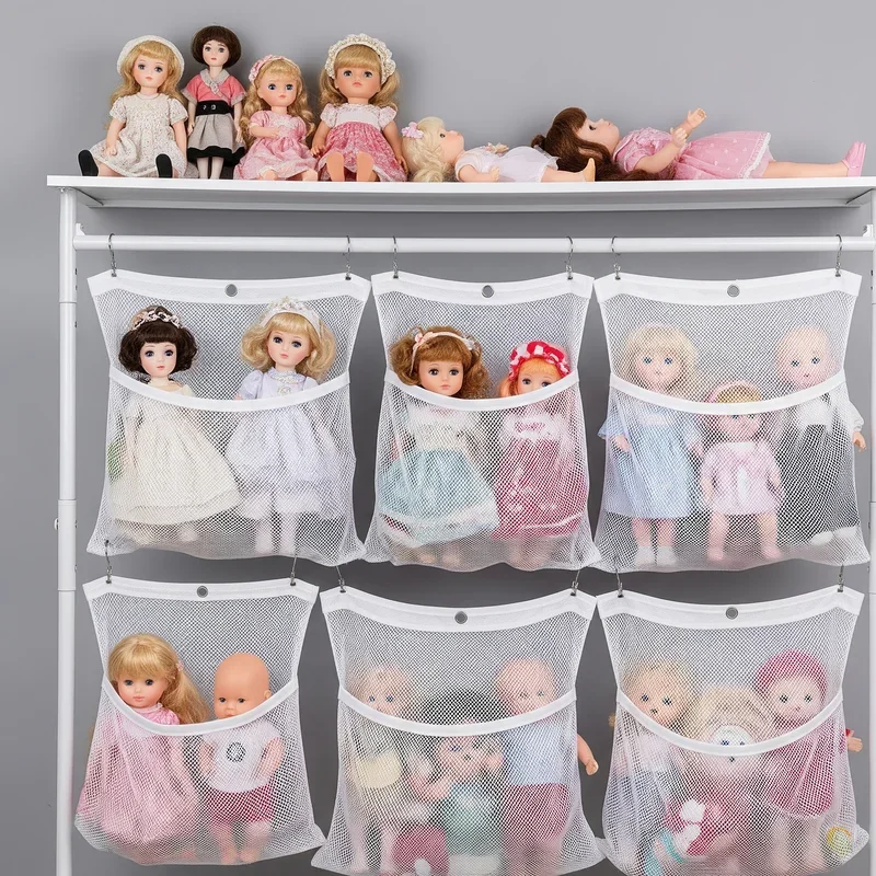 Utilize vertical wall space with colorful mesh bags that turn doll storage into rainbow organization! These lightweight bags hang from hooks, making installation damage-free and renter-friendly. The breathable mesh prevents moisture buildup while keeping dolls visible for easy selection. Assign different colored bags to different children or doll categories for intuitive organization. The soft sides accommodate dolls of various shapes without forcing them into rigid spaces. Lower bags remain accessible to small children while higher ones store special occasion dolls. Add labels with vinyl letters or fabric paint for personalized touches that match room themes. The bags collapse flat when empty, perfect for seasonal storage rotation. Machine-washable options make cleaning simple when dolls inevitably get messy. This budget-friendly solution typically costs under $30 for a complete set!