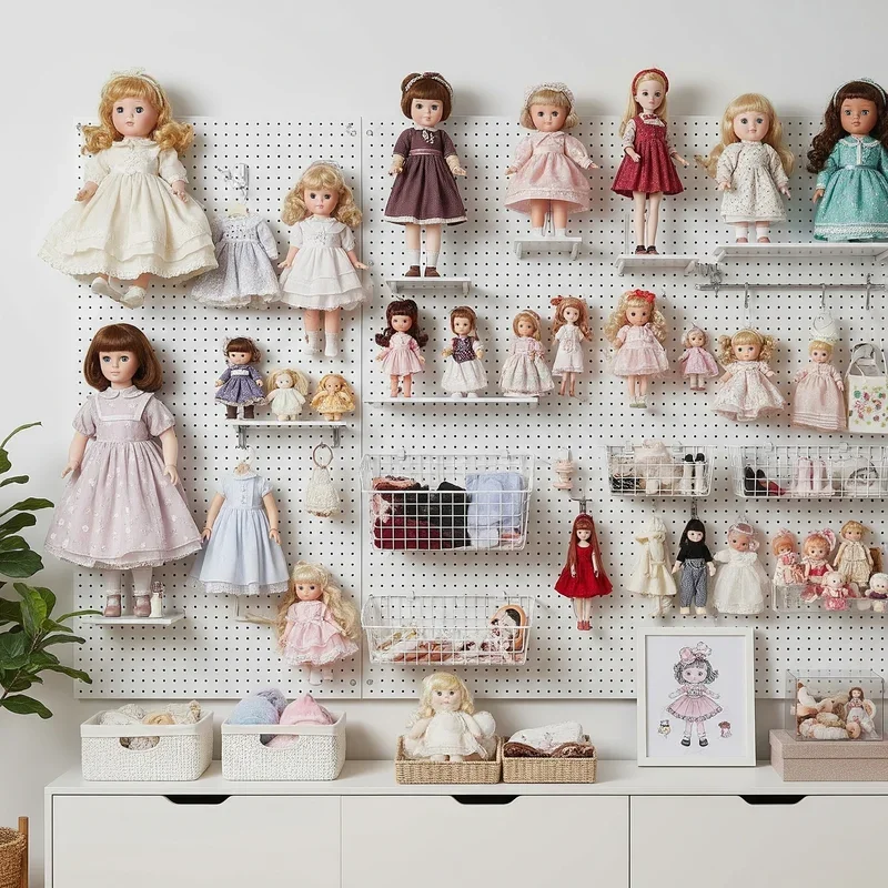 Create an infinitely customizable doll display using pegboard that adapts as collections change! Paint pegboard in fun colors and add various hooks, shelves, and baskets for dimensional storage. Small shelves hold standing dolls while hooks suspend dolls by clothing or specially added loops. The hole pattern allows endless reconfiguration without damaging walls or leaving marks. Add small containers for accessories, creating a complete doll care station on one wall. Include mirrors at doll height for kids to "help" dolls check their appearances. The industrial look works surprisingly well in modern kids' rooms when painted bright colors. Create zones for different children or doll types using colored sections or borders. LED strips behind pegboard create stunning backlit effects for special displays. This system handles everything from tiny collectibles to large baby dolls efficiently!