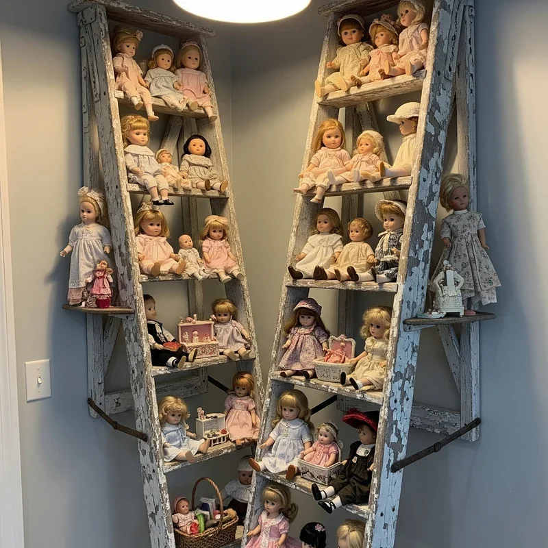 Give an old ladder new life as a charming doll display that adds rustic charm to any room! Lean a wooden ladder against the wall and use rungs as shelves for sitting dolls. Paint or stain the ladder to match room décor, or leave it natural for farmhouse appeal. Hang small baskets from rungs to hold doll accessories and tiny outfits. The angled design means dolls sit naturally without additional support needed. Wrap fairy lights around the ladder for a magical glow during bedtime stories. This solution works especially well for larger dolls that need substantial display space. Secure the ladder to the wall with brackets to prevent tipping accidents. Add hooks on sides for hanging doll purses, hats, or clothing items. The vertical storage creates minimal footprint while offering maximum display potential!