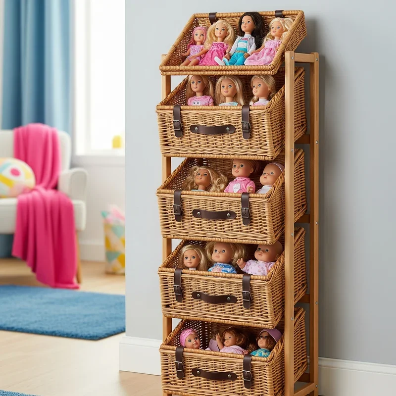 Stack your way to success with a tower of baskets that grows with your collection! Use uniform baskets for clean looks or mix sizes for visual interest and functionality. Label each basket with contents using chalkboard tags that can change as needed. The open-top design allows quick cleanup by simply dropping dolls into designated baskets. Natural materials like wicker add warmth while plastic offers easy cleaning options. Position towers in corners to maximize floor space while maintaining easy access. Add casters to bottom baskets for mobile storage that follows playtime locations. Use liner fabrics to protect delicate dolls and add decorative touches. The graduated sizes accommodate everything from tiny figurines to large baby dolls. This flexible system typically costs $40-60 for a complete multi-basket solution!