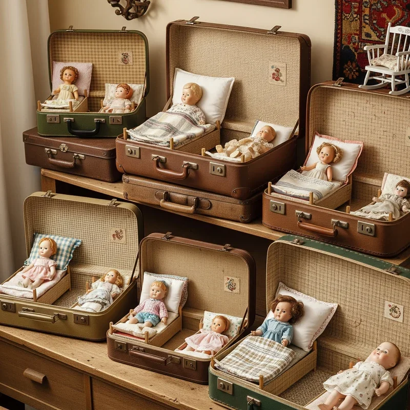 Transform thrift store suitcases into adorable doll beds that double as storage and play furniture! Open suitcases become instant doll bedrooms complete with fabric-lined interiors as bedding. Stack closed suitcases for vertical storage or slide them under real beds when not in use. The portable nature means dolls can travel to grandma's house in style. Add small pillows and blankets to create cozy sleeping spaces that encourage nurturing play. Different sized suitcases accommodate various doll dimensions from tiny to toddler-sized. The vintage aesthetic adds charm to room décor while serving practical purposes. Paint or decoupage suitcases to match room themes or leave original patina for authentic character. Built-in compartments in older suitcases hold accessories and outfit changes. This creative solution typically costs $5-15 per suitcase at thrift stores!