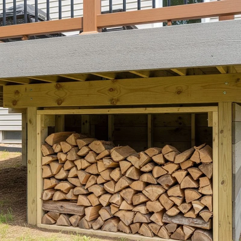 Utilize wasted space beneath raised decks for convenient, already-covered firewood storage. This location provides natural weather protection while keeping wood accessible yet hidden. Install lattice or slat walls to ensure ventilation while preventing wood from contacting deck posts. The existing deck structure eliminates roofing costs, making this an economical option at $100-300 for enclosure materials. Ensure adequate height (minimum 12 inches) between ground and wood using pallets or purpose-built platforms. Grade the ground away from the house for drainage and consider installing French drains in problematic areas. Access doors or removable panels make loading and retrieval easy. This solution maximizes property usage while maintaining clean sightlines. Add lighting for safety during evening wood gathering. The protected environment suits seasoned wood ready for burning rather than green wood needing maximum airflow.