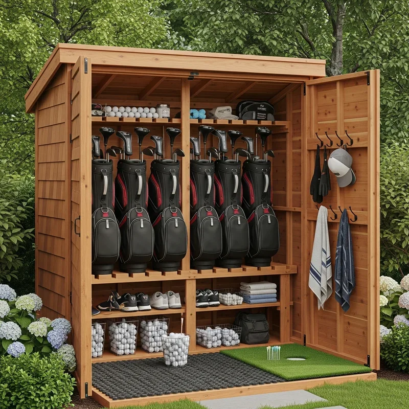 Dedicate an outdoor shed specifically to golf equipment, creating a climate-controlled environment that protects valuable clubs year-round. Insulate sheds to prevent extreme temperature fluctuations that can damage club materials and affect performance. Install proper ventilation to prevent moisture buildup that causes rust and mildew on equipment and bags. Include workbenches for club maintenance and repair, creating a complete golf workshop for serious players. Add electrical outlets for charging electric carts, GPS devices, and running dehumidifiers during humid months. Organize with combination of wall racks, shelving, and floor stands to maximize limited shed space. The separate structure keeps golf equipment completely removed from living spaces while maintaining protection and accessibility. Position sheds conveniently between house and driveway for easy equipment transport.