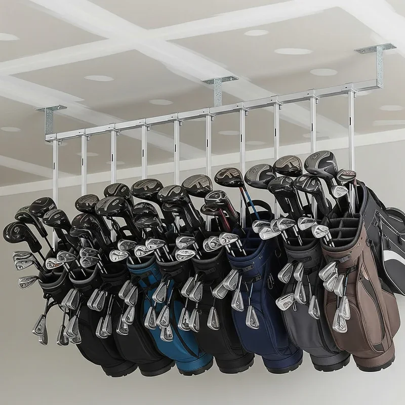 Utilize overhead space with ceiling-mounted systems that keep clubs completely out of the way while remaining easily accessible when needed. These pulley-operated or fixed mounting systems work exceptionally well in garages with high ceilings. Motorized versions lower equipment at the push of a button, bringing clubs down to comfortable height without ladders or stretching. The elevated storage protects clubs from flooding, pests, and accidental damage from vehicles or foot traffic. Include platforms for storing multiple bags, shoes, and accessories all in one overhead location. The system clears valuable floor and wall space for other uses while maintaining easy access to golf gear. Install near garage doors for convenient loading, but away from door tracks to prevent interference. This solution maximizes vertical space that typically goes unused in most garages.