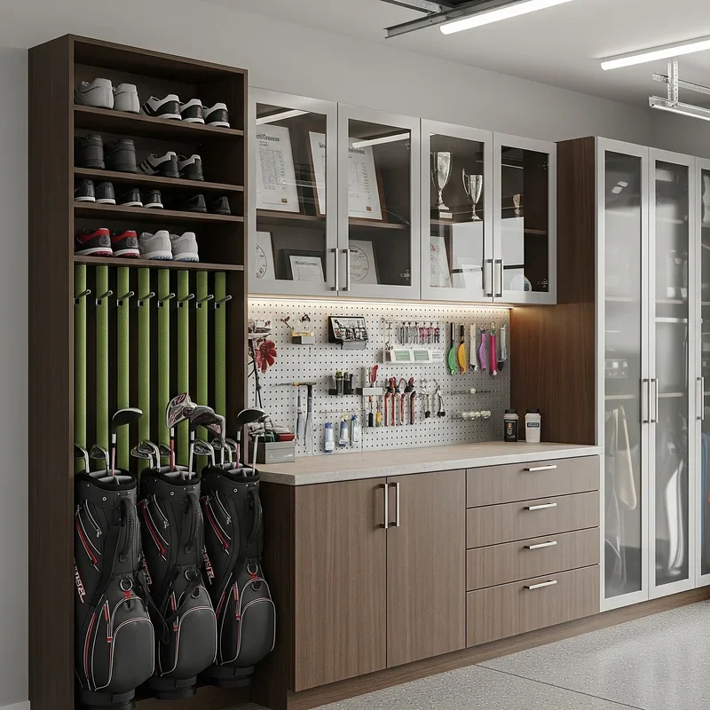 Install dedicated garage cabinets designed specifically for golf equipment, featuring customized interiors that accommodate clubs, bags, and accessories perfectly. These enclosed storage solutions protect gear from dust, moisture, and temperature extremes that can damage equipment over time. Adjustable shelving allows configuration changes as your equipment collection grows or changes. Include drawers for smaller items like balls, tees, and gloves, keeping everything organized and easily accessible. Ventilated doors prevent moisture buildup while maintaining a clean, closed appearance when not in use. Some cabinets feature built-in locks for security, particularly important for expensive equipment or shared garage spaces. The closed storage keeps your garage looking neat and organized, hiding golf gear when entertaining or working on projects. Position cabinets near interior doors for climate benefits compared to exterior walls.