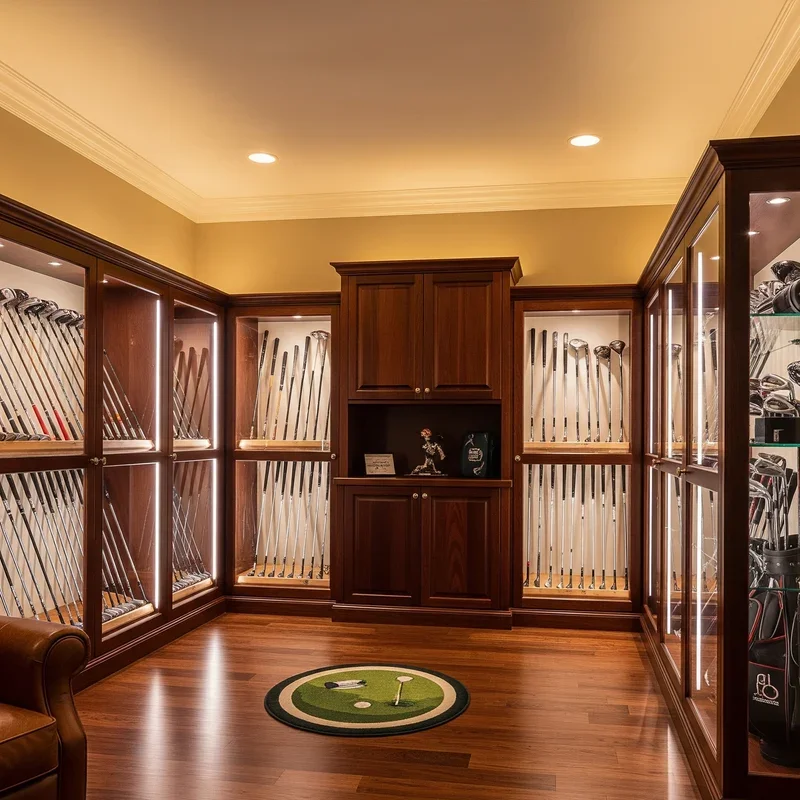 Showcase your prized clubs like the investments they are with elegant display cases that protect while presenting your collection beautifully. These glass-fronted cabinets keep clubs dust-free while allowing you to admire your equipment even when not playing. Choose from wall-mounted shadow boxes for individual special clubs or floor-standing cases for complete sets. LED lighting inside cases highlights club details and creates an impressive focal point in game rooms or offices. Locking mechanisms protect valuable or vintage clubs from curious hands while maintaining visibility. Include humidity control features to prevent rust and maintain optimal conditions for club preservation. Custom foam inserts cradle each club securely, preventing movement and potential damage. This storage method works perfectly for collectors, serious players with multiple sets, or anyone who views their clubs as functional art.