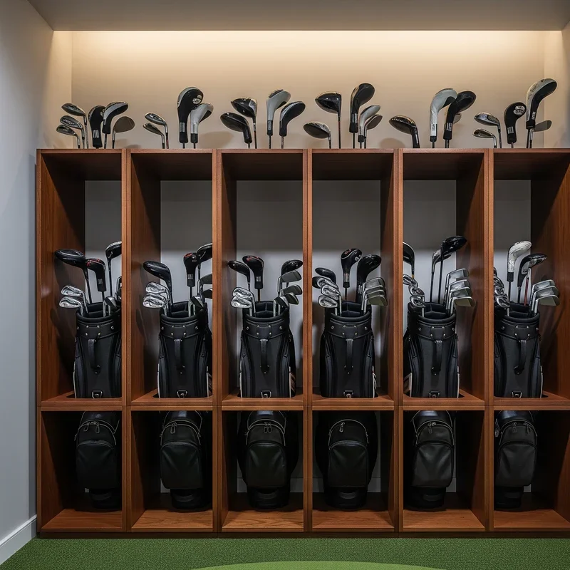Transform a spare closet into a dedicated golf equipment room with customizable organization systems designed for vertical storage efficiency. Install adjustable shelving and hanging rods at various heights to accommodate bags, clubs, and accessories. Use over-door organizers for shoes, gloves, and small accessories that otherwise get lost in larger storage areas. The enclosed environment protects equipment from dust and maintains more consistent temperature and humidity than garage storage. Add drawer units for balls, tees, and maintenance supplies, keeping everything contained and organized. Include a small bench or stool for comfortable shoe changes and equipment maintenance tasks. The closet door provides additional storage opportunity with hooks or racks for towels and rain gear. This solution works particularly well in finished basements or spare bedrooms.