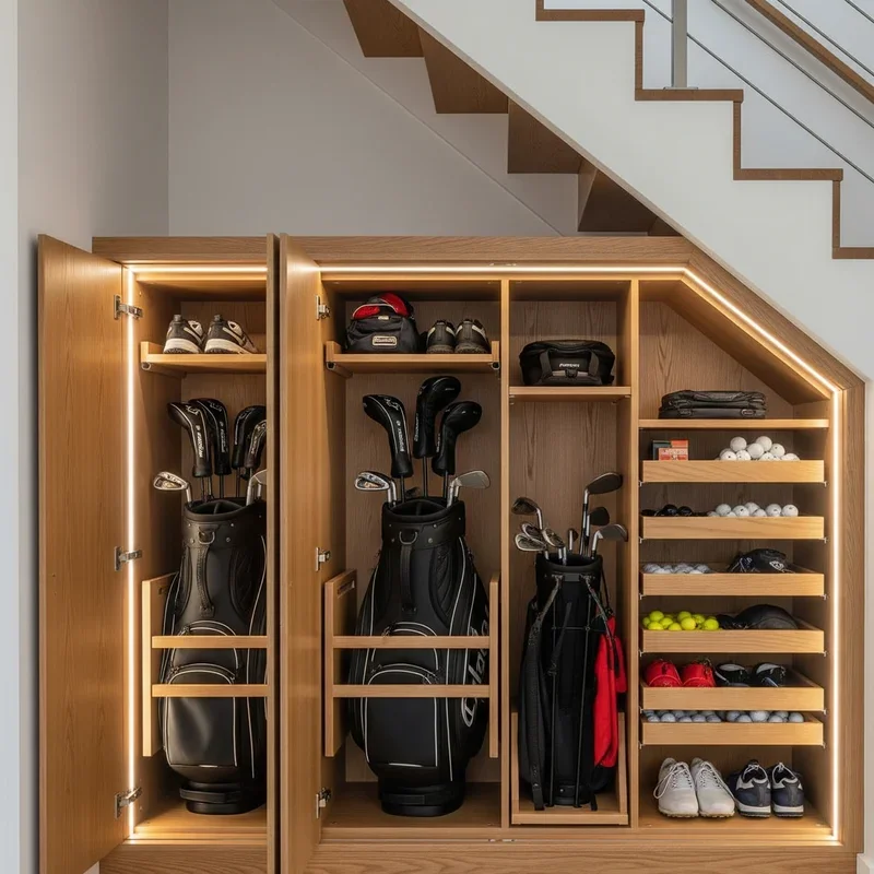 Convert that awkward under-stairs space into a custom golf storage area that utilizes every inch of typically wasted space. The sloped ceiling naturally accommodates clubs of varying lengths, with drivers fitting in taller sections and putters in shorter areas. Install pull-out drawers on tracks for easy access to equipment stored in deep recesses. Add lighting to illuminate dark corners, making club selection easy even in poorly lit areas. The enclosed nature protects equipment from basement moisture or temperature fluctuations better than open storage. Include hooks and shelving for bags, shoes, and accessories, creating a complete golf closet. This hidden storage keeps equipment secure and out of sight while maintaining easy access when needed. The unique dimensions of under-stairs spaces often accommodate multiple bags and full equipment collections surprisingly well.