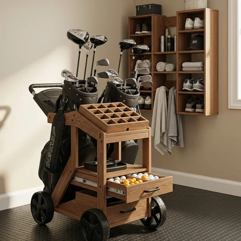 Invest in a rolling golf cart that serves double duty as mobile storage and convenient transport for practice sessions. These wheeled units hold your bag securely while providing additional storage for shoes, balls, and accessories. The mobility factor means you can roll your entire setup from storage to vehicle without multiple trips. Look for carts with sturdy wheels that handle various terrains from smooth garage floors to gravel driveways. Folding designs save space when not in use, collapsing flat against walls or sliding under workbenches. Include models with scorecard holders, beverage holders, and umbrella mounts for complete functionality. The elevated bag position reduces back strain when accessing clubs, making practice sessions more comfortable. This solution particularly benefits players who frequently visit driving ranges or practice facilities.