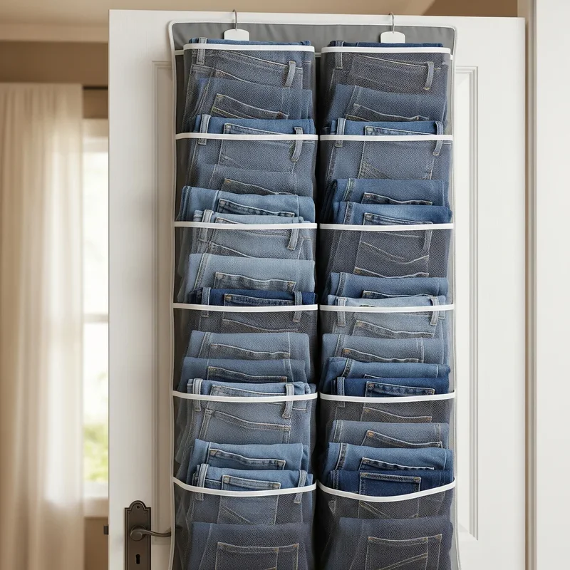 Unlock hidden storage potential with over-the-door organizers that turn unused door backs into denim headquarters! These hanging systems feature multiple pockets or bars perfect for storing rolled or folded jeans within easy reach. Choose from canvas pockets for a soft touch or metal racks for durability and ventilation. Each pocket or rung can hold one to two pairs, depending on thickness and folding method. The vertical arrangement means you can see all options without digging through piles. This solution is perfect for renters who can't make permanent modifications to their space. Position frequently worn pairs at eye level and special occasion jeans higher up. Clear pockets help identify specific washes or styles quickly. The door location keeps jeans accessible but out of valuable closet real estate. No more choosing between clothes and having a navigable bedroom!