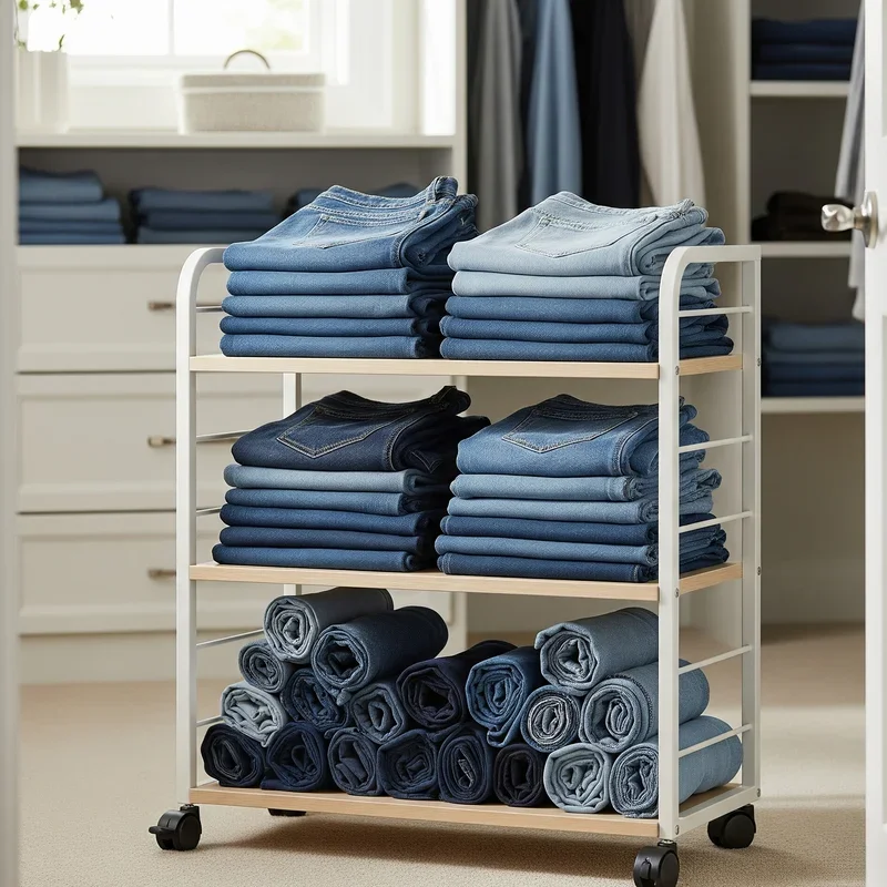 Mobilize your jeans storage with a rolling cart that brings flexibility to small spaces! These multi-tiered carts fit in narrow gaps between furniture or tuck into closets when not needed. Each shelf holds several pairs of rolled or folded jeans, visible and accessible from all angles. The wheeled design means you can roll your entire jean collection wherever needed for outfit planning. Choose from metal mesh for ventilation or solid shelves for a cleaner look. Add small baskets or dividers to shelves for belts and denim care products. The portable nature makes deep cleaning and room rearranging infinitely easier. Use the top tier as a folding station when organizing laundry. This solution adapts as your storage needs change over time. Your jeans storage just became as mobile as your lifestyle!