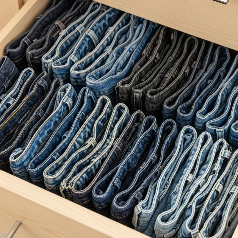 A1: File folding in drawers or vacuum-sealed bags offer maximum space efficiency for jeans.
