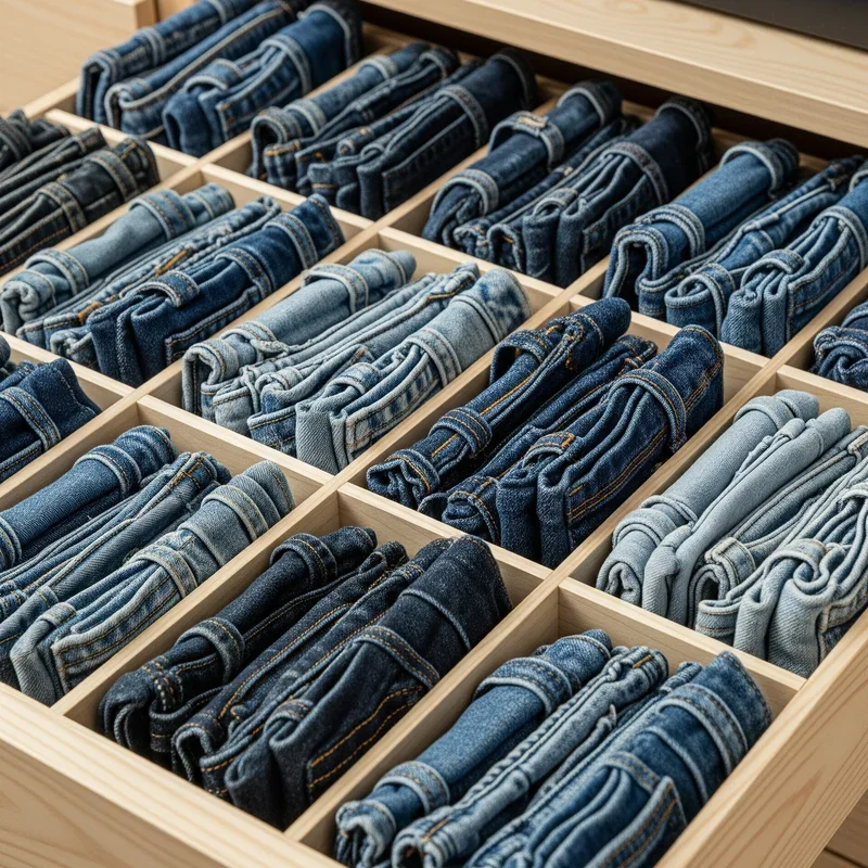 Conquer drawer chaos with adjustable dividers that create dedicated denim compartments! These organizational tools transform jumbled drawers into neat sections where each pair has its designated home. Bamboo or plastic dividers adjust to fit various drawer sizes and jean quantities. Create sections based on jean style: skinny, straight, bootcut, or wide-leg for easy selection. The compartmentalization prevents jeans from migrating and mixing during daily drawer access. Roll jeans tightly to maximize space within each section, fitting more pairs than traditional folding. This system works especially well for deep drawers that typically become black holes. The visual organization reduces decision fatigue during rushed morning routines. You can even assign compartments to different family members sharing drawer space. Your drawers just graduated from chaos to calm!