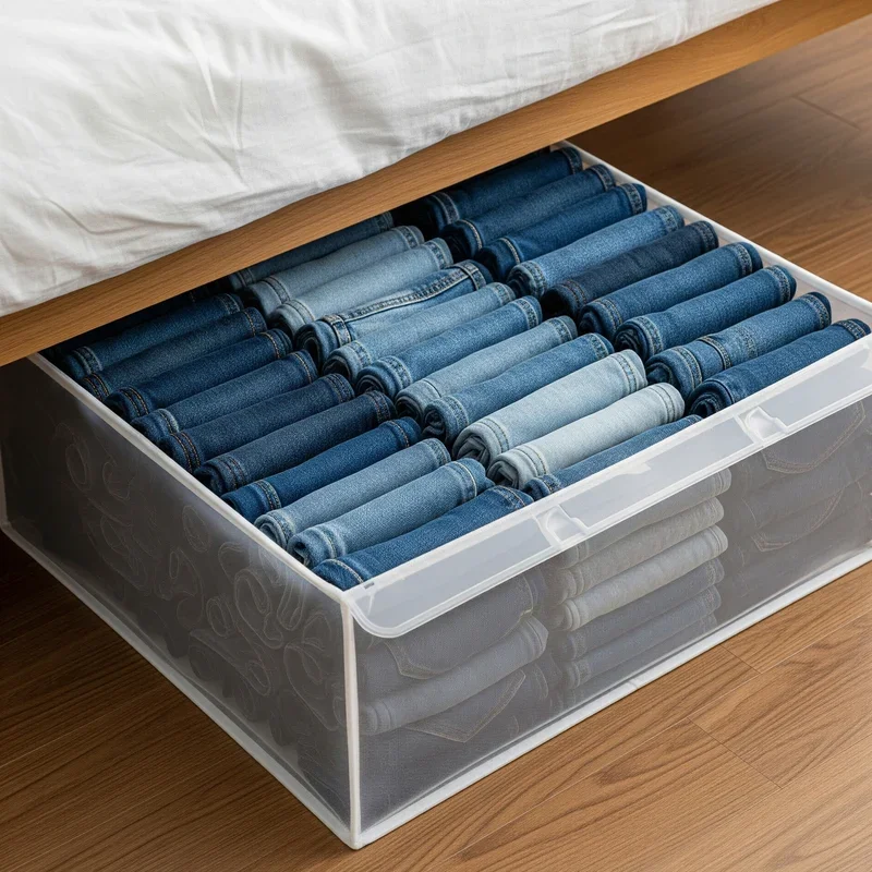 Transform the forgotten wasteland under your bed into prime jeans real estate with specialized storage boxes! These low-profile containers slide effortlessly beneath bed frames, utilizing space that typically collects dust bunnies. Choose clear boxes to identify contents quickly or decorative options that complement your bedroom décor. Wheels or sliding mechanisms make accessing jeans effortless, even from the far corners. Store off-season jeans here to free up prime closet space for current favorites. Cedar inserts or lavender sachets keep stored denim fresh and moth-free during longer storage periods. Label boxes by size, style, or season for quick identification without pulling everything out. The enclosed environment protects jeans from dust and pet hair. This method works particularly well for guest room beds that see infrequent use. Your bed just became a secret storage superhero!