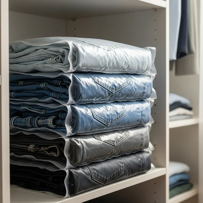 Shrink your off-season jeans to a fraction of their size with vacuum-sealed storage bags! These space-age solutions compress bulky denim into flat packages perfect for shelf tops or under-bed storage. Simply fold jeans, place in bags, and vacuum out air for maximum compression. Each bag can hold multiple pairs while protecting from dust, moisture, and pests. Label bags clearly with contents and sizes to avoid opening multiple bags when retrieving specific pairs. The airtight seal preserves denim quality during long-term storage between seasons. This method works brilliantly for maternity jeans, different sizes, or special occasion denim. Stack compressed bags vertically in closets or horizontally under beds. The space savings are dramatic, often reducing volume by 75 percent! Your seasonal storage just got a major upgrade!