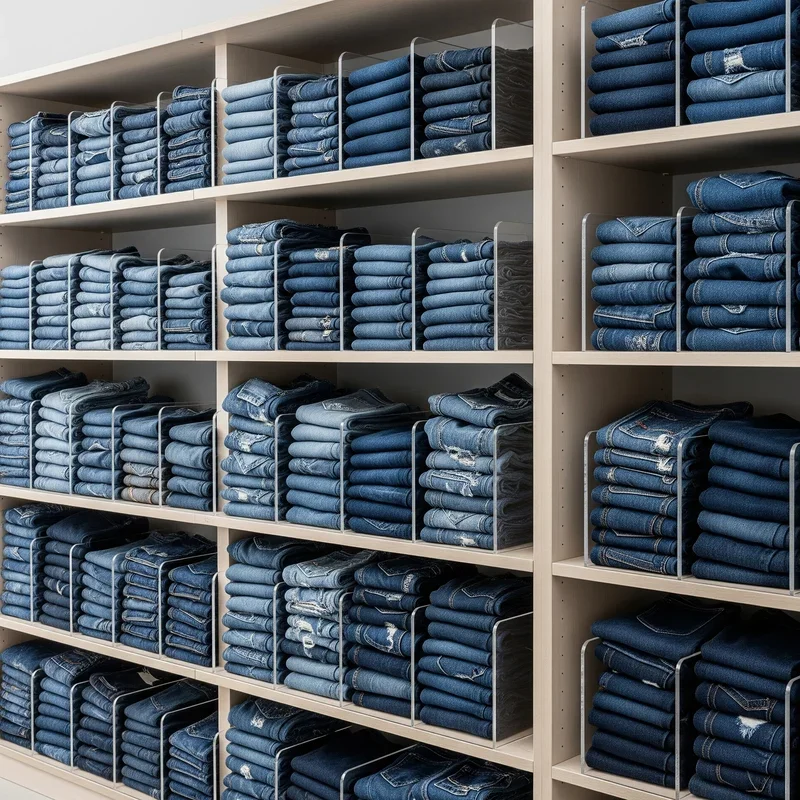 Create order on closet shelves with vertical dividers that keep jean stacks from toppling! These wire or acrylic partitions clip onto shelves, creating distinct sections for different jean categories. No more domino effect when pulling one pair from a precarious pile! Space dividers based on your jean collection size and folding preferences. The clear visibility helps you maintain organization and quickly spot the pair you need. Use dividers to separate jeans by family member, size, or style for intuitive organization. The vertical supports allow higher stacking without stability concerns. This system works equally well on wire or solid shelves. Add labels to shelf edges for quick identification of each section's contents. Your shelf space just became a well-organized denim library!