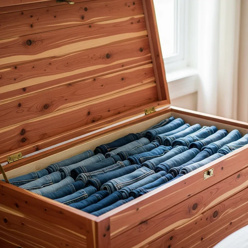 Embrace vintage charm while protecting your denim investment with a cedar chest at your bed's foot! These classic storage pieces offer generous capacity for seasonal or special jeans while doubling as bedroom seating. Natural cedar repels moths and absorbs moisture, keeping stored jeans fresh without chemicals. The hinged top provides easy access while keeping contents dust-free and organized. Layer jeans with cedar blocks or lavender sachets for extra protection and pleasant scent. Use dividers or boxes within the chest to separate different sizes or styles. The furniture piece adds character to bedrooms while solving storage dilemmas elegantly. Position near windows for a cozy reading nook with hidden storage below. Vintage chests from estate sales offer unique style at reasonable prices. Your storage solution just became an heirloom piece!