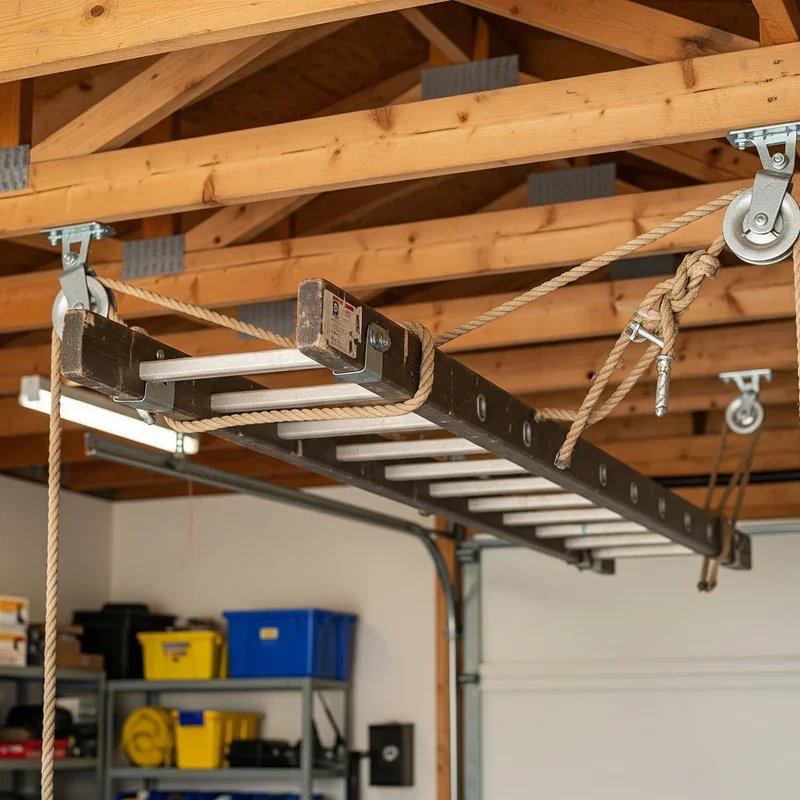 Transform your ceiling into a storage powerhouse with a pulley system that lifts ladders completely out of your way! This brilliant solution uses mechanical advantage to hoist even heavy extension ladders effortlessly to the ceiling. Install sturdy eye bolts into ceiling joists, thread quality rope through pulleys, and create a system that makes storing ladders as easy as raising a flag. The beauty lies in accessibility; lower your ladder when needed, then send it skyward when work's done. Add a cleat to the wall for securing the rope, ensuring your ladder stays put until you need it. This method works especially well in garages with high ceilings where vertical space goes unused. The initial investment in quality pulleys and rope pays off through years of convenient, floor-clearing storage that maximizes every square foot.