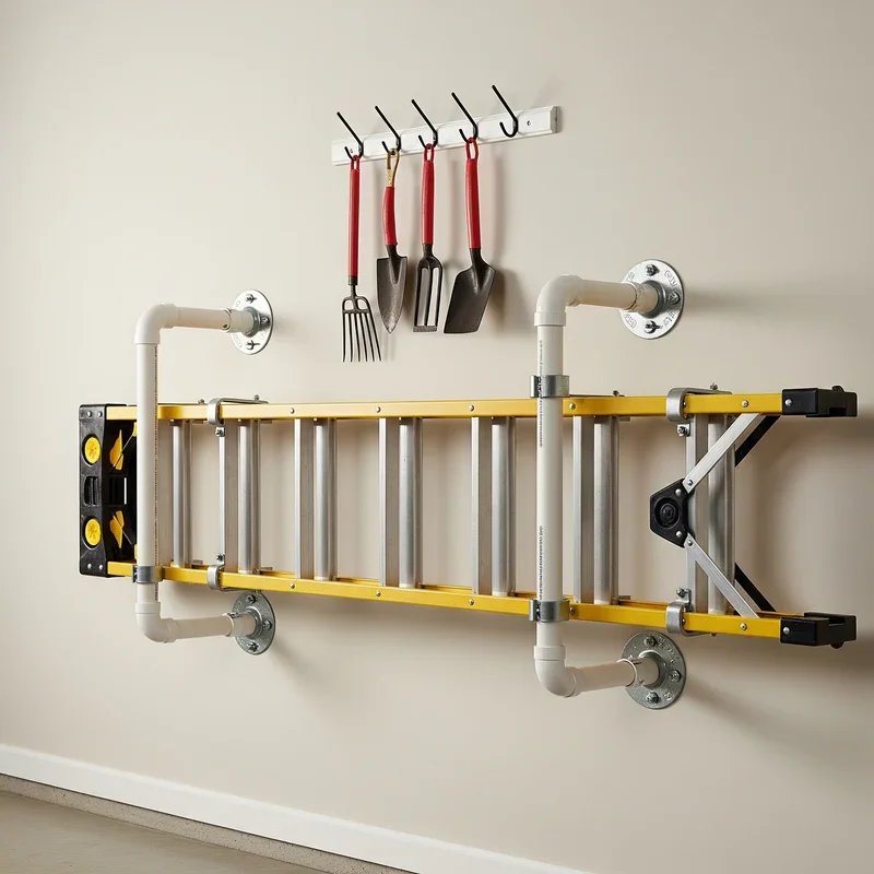 Construct affordable ladder storage using PVC pipes that create custom holders matching your specific ladder dimensions! Cut pipes to create U-shaped cradles that mount to walls, holding ladder rungs securely without slipping. The lightweight material installs easily while providing surprisingly strong support for standard ladder weights. PVC's smooth surface won't scratch ladder finishes while the white color brightens dark workshop corners. Create modular systems where pipe sections connect for storing multiple ladders in organized rows. The budget-friendly materials make this perfect for temporary storage or workshop spaces requiring economical solutions. Customize pipe configurations for different ladder styles, from simple straight holders to angled supports for specialty ladders.