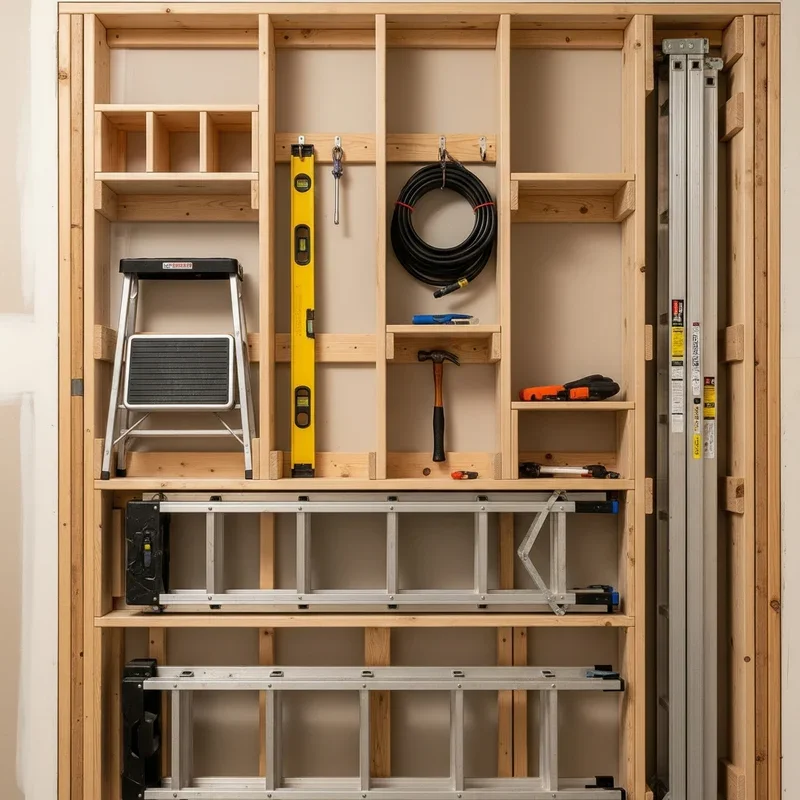 Utilize the space between wall studs for storing narrow ladders like step stools and compact folding models! Cut openings in drywall between studs, creating recessed storage that doesn't protrude into workshop space. Install cleats or brackets inside stud bays to support ladders securely within wall cavities. This near-invisible storage solution maintains clean wall surfaces while providing convenient ladder access. The method works especially well for frequently used household ladders that need quick accessibility. Finish openings with trim for professional appearance that looks intentional rather than makeshift. This creative approach maximizes storage in finished workshops where external mounting might damage walls.