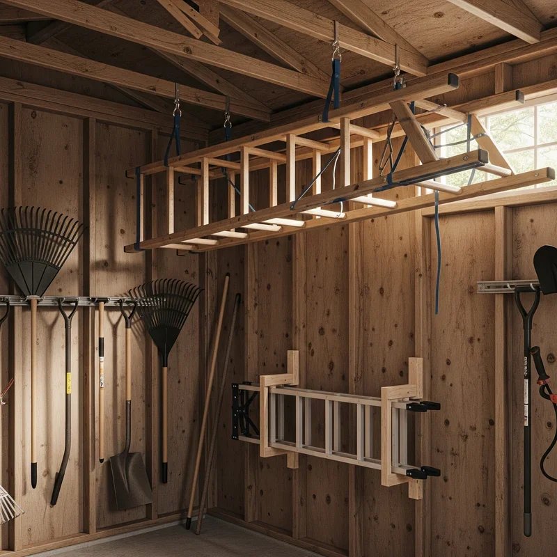 Maximize workshop space with 15 smart ladder storage ideas! From ceiling hooks to wall racks, discover solutions for every ladder type and space.
