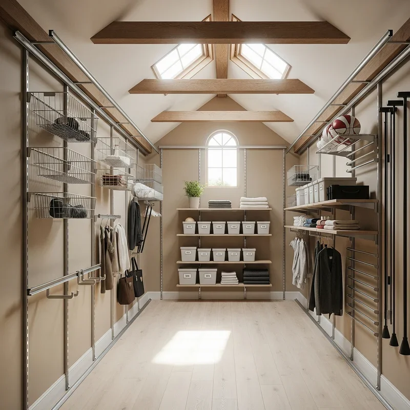 Revolutionize your loft walls with track systems that turn vertical surfaces into customizable storage playgrounds! These rails accept various attachments like hooks, baskets, and shelves that can be repositioned instantly without tools. Install tracks at different heights to create zones for different family members or storage categories. The industrial look works beautifully in modern lofts while painted versions blend with traditional décor. Use them to hang bikes vertically, organize tools, or create modular closet systems without permanent installation. The flexibility means you can adjust spacing between attachments as your collection grows or shrinks. Heavy-duty tracks handle substantial weight when properly anchored to studs, perfect for sporting equipment or heavy boxes. Add specialized attachments like ski racks or guitar hangers for hobby-specific storage. This system grows with your needs, making it a smart long-term investment for evolving storage requirements!