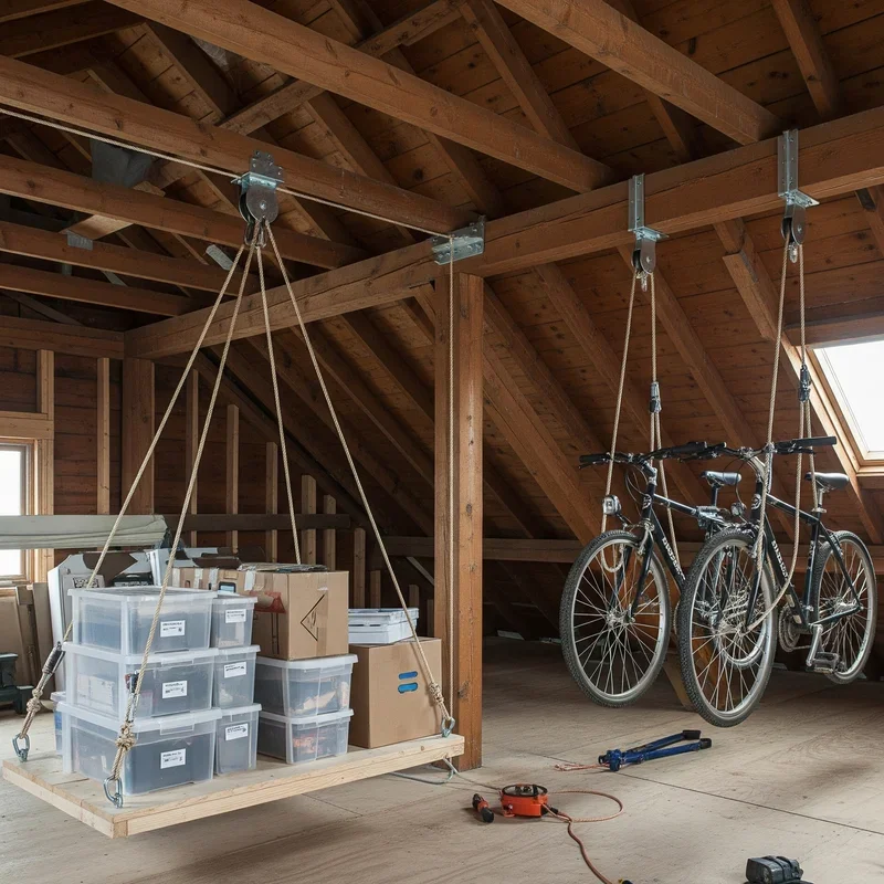 Work smarter, not harder, with pulley systems that make storing heavy or bulky items in your loft effortless! These mechanical marvels let you hoist bikes, kayaks, or storage platforms up and out of the way with minimal effort. Install pulleys rated for your intended weight load, always exceeding requirements for safety margins. Use locking mechanisms to secure items at desired heights, preventing accidental releases. The mechanical advantage means even heavy items become manageable for single users or older family members. Position pulleys strategically to avoid head-bumping zones while maximizing ceiling height usage. Choose coated cables to prevent rust and reduce noise during operation. Add platforms or nets for storing multiple smaller items together, raising and lowering entire categories at once. This system particularly benefits seasonal storage, making decoration swaps simple and safe. Your loft ceiling becomes an elevator system for your stuff!