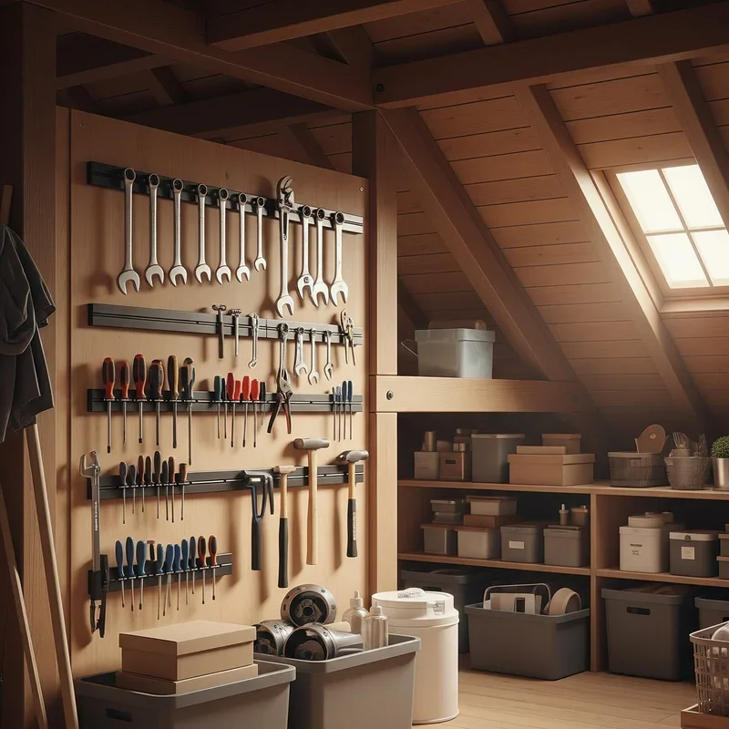 Harness the power of magnetism to keep metal items organized and instantly accessible on your loft walls! Install strong magnetic strips at convenient heights for storing tools, craft supplies, or kitchen overflow items. This system eliminates rummaging through toolboxes while keeping everything visible for quick selection. Position strips near workbenches or craft areas for efficient workflow during projects. The vertical storage frees up drawer and surface space for non-magnetic items. Use multiple strips to categorize items: one for screwdrivers, another for scissors and cutting tools. Paint strips to match walls for subtle integration or choose contrasting colors for industrial appeal. Add small metal containers to strips for holding screws, nails, or small parts. This solution particularly benefits hobbyists who need frequent tool access. Your metal items become wall art that's both decorative and functional!