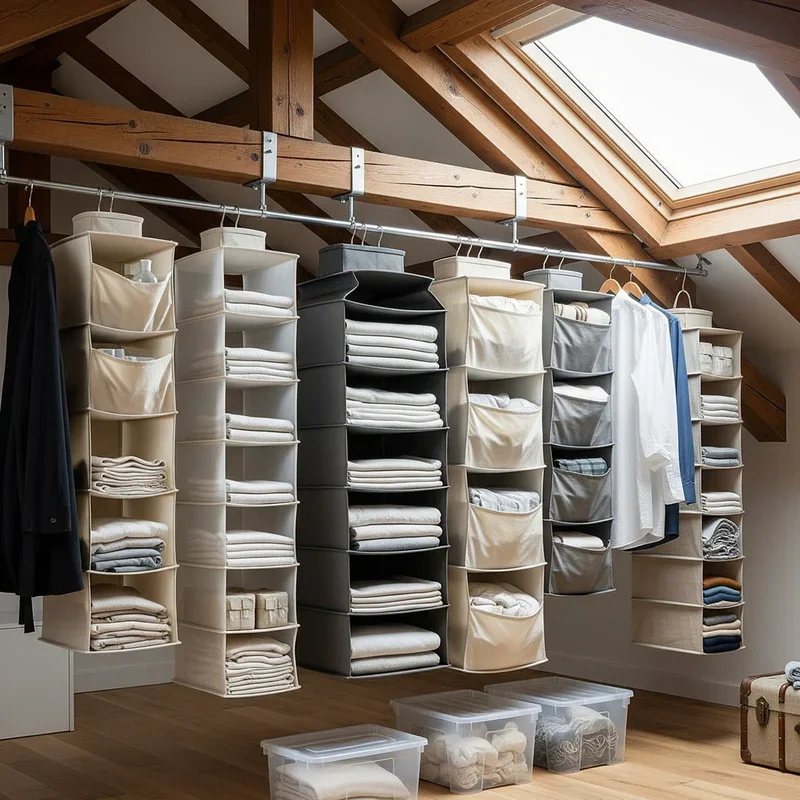 Soften your loft's hard edges while adding substantial storage with hanging fabric organizers that maximize vertical space! These lightweight solutions hang from rods, hooks, or beams, providing pockets and compartments for everything from shoes to craft supplies. The fabric construction means they're quiet to use, important in lofts above bedrooms. Choose breathable materials to prevent mustiness in potentially humid loft environments. Clear vinyl pockets let you see contents while protecting items from dust. The collapsible nature means they store flat when not needed, perfect for seasonal organization. Use over-door styles on loft access doors for immediate organization upon entry. Color-code organizers by family member or storage category for intuitive use. The soft sides accommodate oddly shaped items that rigid containers can't handle. Your loft gains storage that's as flexible as fabric itself!