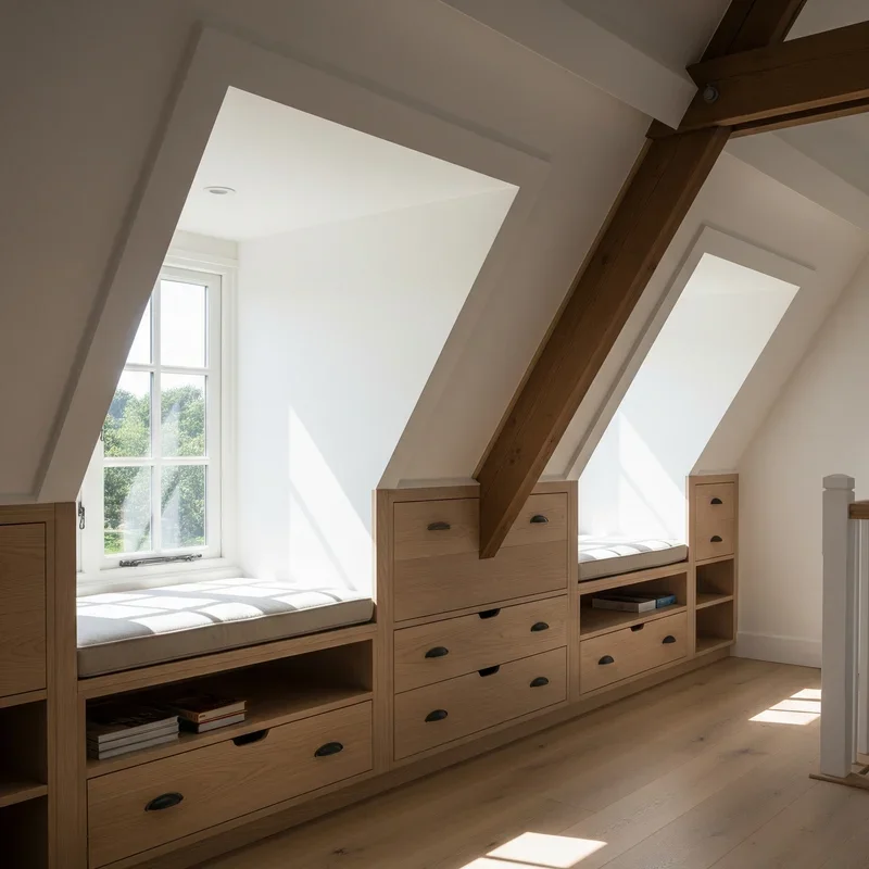 Turn those charming dormer windows into dual-purpose features with built-in window seats hiding storage treasures! These cozy nooks provide perfect reading spots while concealing deep storage compartments beneath hinged seats. Use the space for blankets, books, or seasonal items that benefit from easy access. Add cushions on top for comfort and style, creating inviting spaces that draw people up to your loft. Install gas struts for safe, controlled opening that prevents finger-pinching accidents. The natural light from dormers makes these spots ideal for craft storage where good visibility matters. Build in bookshelves on either side to maximize every inch around the window frame. These seats add architectural interest while solving storage dilemmas, increasing both function and property value. Paint interiors with moisture-resistant paint to protect against condensation common near windows. Your dormers become destination spots rather than awkward architectural features!