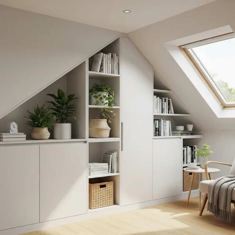 Those slanted walls in your loft aren't obstacles; they're opportunities disguised as architectural features! Built-in eaves storage transforms dead space into highly functional compartments that follow your roofline perfectly. Install custom drawers that slide out smoothly, making use of every inch from floor to where the ceiling gets too low. These can hold everything from seasonal clothing to holiday decorations, keeping items dust-free and organized. Consider adding soft-close mechanisms to prevent slamming in these tight spaces. The beauty lies in creating doors that blend seamlessly with your walls, maintaining clean lines while hiding massive storage capacity. Use the deepest parts for rarely accessed items and keep everyday necessities in the easier-to-reach sections. Paint everything in light colors to prevent the space from feeling cramped. This investment pays off by essentially adding closet space where none existed before!
