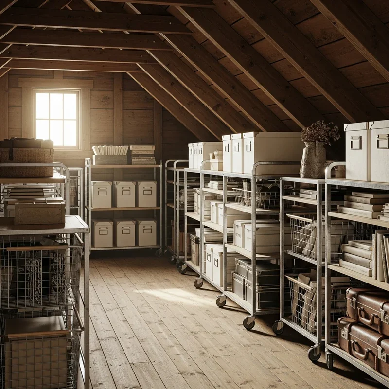 Mobility changes everything when dealing with loft storage, and rolling carts are your secret weapons for accessibility! These portable units slide effortlessly between tight spaces and can be repositioned based on current projects or seasonal needs. Choose carts with locking wheels to prevent unwanted movement on potentially uneven loft floors. Multi-tiered designs maximize vertical space while maintaining a small footprint perfect for narrow passages. Use them as mobile craft stations, tool organizers, or seasonal decoration hubs that can be wheeled to the loft hatch when needed. The open design allows you to see contents at a glance, eliminating the "out of sight, out of mind" problem. Industrial metal carts handle heavy loads, while lighter plastic versions work for linens or lightweight items. Group similar items together on each cart for themed organization that makes sense. Your loft becomes a dynamic space where storage adapts to you!