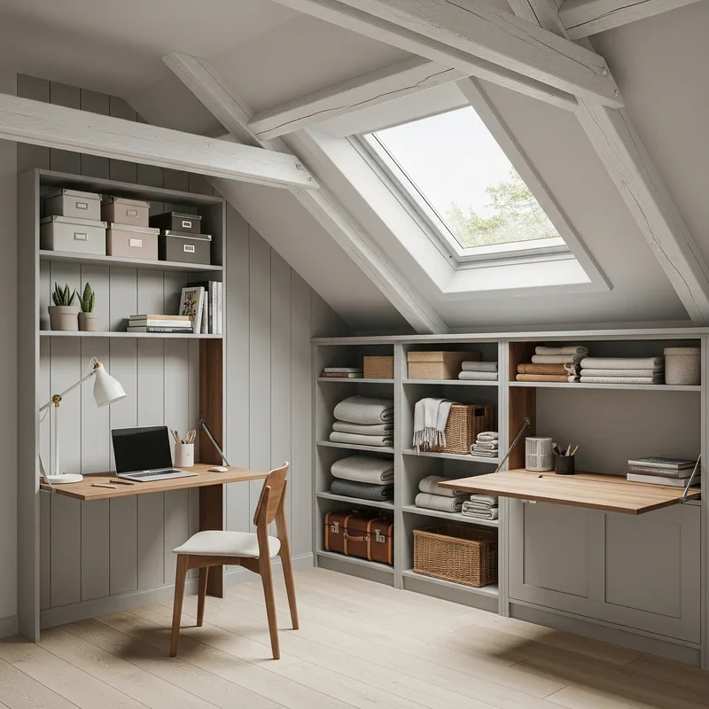 Create instant workspaces that disappear when not needed with fold-down desk stations perfect for loft offices! These wall-mounted surfaces provide full desk functionality without permanently consuming precious floor space. When folded up, they're barely noticeable, maintaining your loft's spacious feel. Include built-in storage compartments that remain accessible even when desks are folded, holding supplies and equipment. Install at standing or sitting heights based on your work preferences and loft ceiling constraints. Add power strips and cable management systems for clean, organized tech setups. The temporary nature makes them perfect for occasional projects or homework stations that don't dominate daily loft life. Use piano hinges for smooth, quiet operation that won't disturb others below. Support brackets ensure stability for computers and heavy items. Your loft becomes a transformable space that adapts to work and leisure needs!