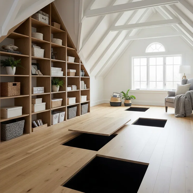 Transform your loft floor into a secret storage network with hidden compartments that nobody would suspect exist! If your loft has raised flooring or you're planning renovations, incorporate trap doors leading to between-joist storage spaces. These compartments work perfectly for valuables, important documents, or items needing extra protection from temperature fluctuations. Install piano hinges for smooth operation and magnetic catches to keep doors flush with surrounding flooring. Line compartments with cedar to protect textiles from moths or use moisture barriers for sensitive items. The discrete nature makes them ideal for storing surprise gifts or private collections. Size compartments based on joist spacing, typically yielding long, narrow storage perfect for wrapping paper, sporting equipment, or musical instruments. Add LED lights that activate when opened for easy viewing. This James Bond-style storage maximizes space without adding any visual clutter to your loft!