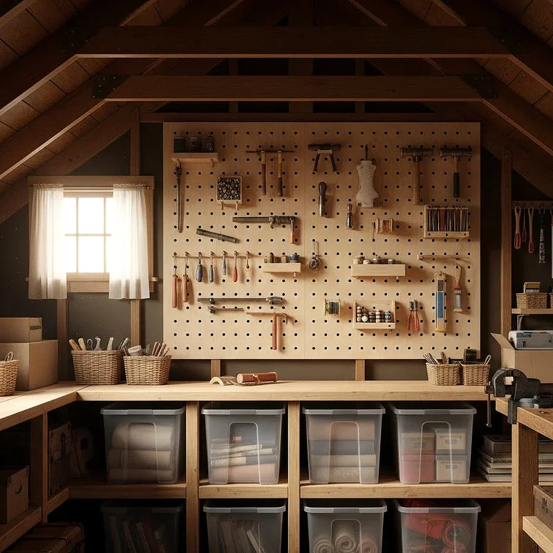 Pegboards aren't just for garages anymore. Installing pegboard panels on your attic's knee walls or in central areas creates incredibly versatile storage that adapts to your changing needs. You can hang hooks, baskets, and shelves anywhere on the board, rearranging them whenever your storage requirements change. This system keeps items off the floor and clearly visible, making it easy to find what you need without digging through boxes. Use pegboards to organize tools, craft supplies, holiday decorations, or any small items that tend to get lost in larger storage containers. Paint the pegboard a light color to reflect light in your attic, making the space brighter and more inviting. The flexibility and accessibility make them ideal for low attics.