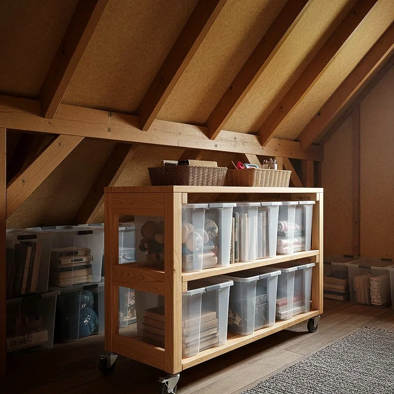 A rolling cart designed for your specific attic dimensions provides mobile storage that adapts to your changing needs. Choose or build a cart low enough to fit under the lowest sections of your sloped ceiling, with sturdy wheels that handle attic flooring. Load it with frequently accessed items that you regularly rotate, like seasonal decorations that change throughout the year or hobby supplies you're currently using. The cart can roll to wherever you're working in the attic, bringing supplies within easy reach without multiple trips up and down stairs. When not in use, tuck it under an eave or against a wall where it doesn't impede movement. Consider a cart with multiple shelves or basket levels to maximize vertical storage within the cart itself.