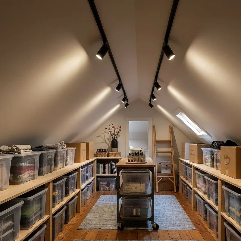 A well-lit attic makes storage and retrieval infinitely easier and safer. Many attics have inadequate lighting, making organization difficult and increasing the risk of trips and falls. Installing track lighting along the center ridgeline or on walls illuminates your entire storage space effectively. LED track lights are energy-efficient, produce minimal heat, and can be directed exactly where you need light. Good lighting helps you quickly locate items, read labels, and safely navigate around stored belongings. Consider adding motion-sensor switches so lights automatically turn on when you enter the attic, keeping your hands free for carrying items. Proper lighting transforms your attic from a dark, forbidding space into an accessible storage area you'll actually want to use.