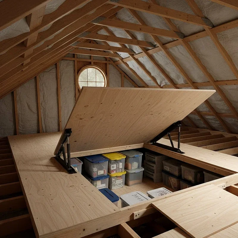 Creating a platform with hidden storage underneath is a brilliant way to maximize low attic space. Build a solid platform across part of your attic floor using plywood over a frame that's raised about twelve to eighteen inches. The platform creates a level surface for stacking lighter storage items while the space underneath becomes accessible storage. Install hinged sections in the platform that lift up, allowing you to access the storage cavity below. This works exceptionally well for long, flat items like wrapping paper rolls, skis, or lumber that fit naturally in shallow horizontal spaces. You can also store off-season clothing in flat storage bags underneath. Make sure to include finger pulls or handles on the lift-up sections for easy opening.
