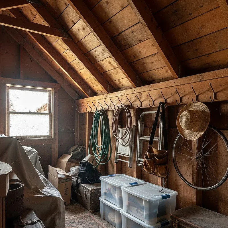 Sometimes the simplest solutions are the most effective. Wall-mounted hooks along your attic's vertical walls provide instant hanging storage for items that don't fit well in boxes. Heavy-duty hooks can hold seasonal wreaths, garment bags, sleeping bags, camping gear, or sports equipment like tennis rackets and fishing rods. This keeps items off the floor and prevents them from getting crushed under stacked boxes. Choose hooks appropriate for your wall type and the weight of items you'll hang. Screw hooks directly into studs for maximum strength. Create zones for different categories of items, making it easy to find what you need. Hanging storage also allows air circulation around items, which helps prevent musty odors and mildew in attics.