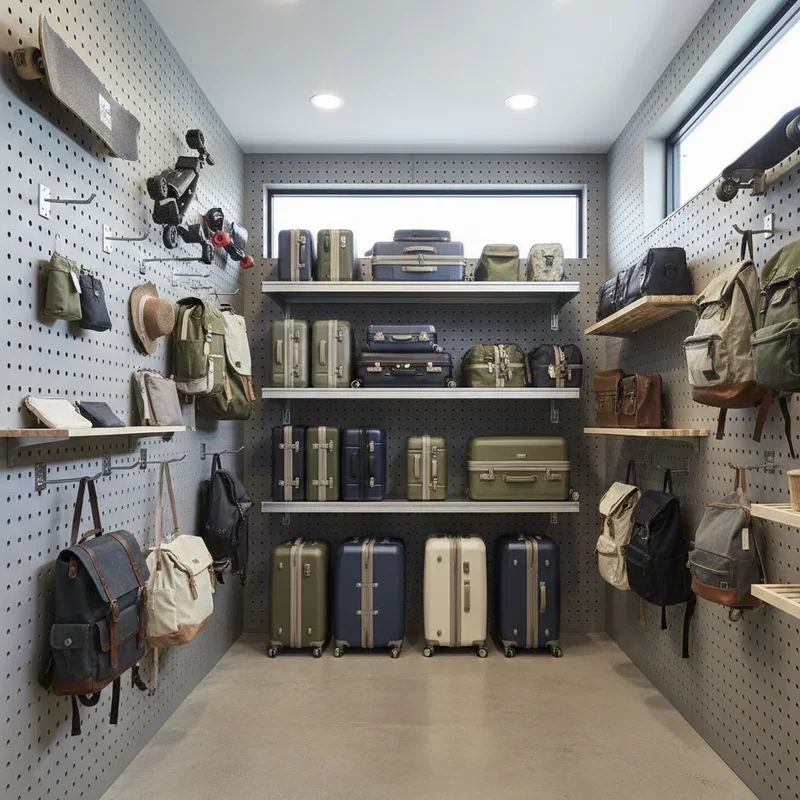 Pegboard installations offer incredibly versatile storage that you can customize endlessly to accommodate changing needs and preferences. Mount a large pegboard section in your garage, mudroom, or utility closet for maximum organizational potential. Use heavy-duty hooks and brackets to hang backpacks, duffel bags, and lightweight carry-ons at varying heights. The beauty of pegboards lies in their adaptability; simply move hooks around whenever your storage requirements change. You can also attach small baskets or shelves to hold travel accessories, chargers, and toiletry bags together. Paint your pegboard in bold colors to transform purely functional storage into an eye-catching design element. This system keeps everything visible and accessible, eliminating the frustration of digging through closets searching for specific items. Plus, installation requires minimal tools and skills that most homeowners already possess.