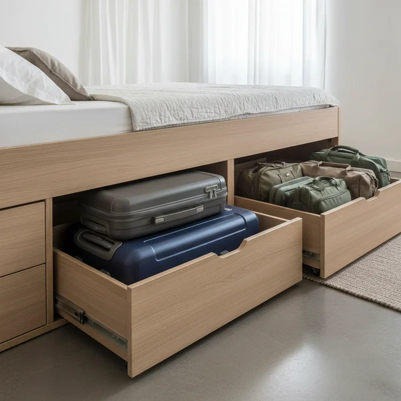 The space beneath your bed offers prime real estate for luggage storage that most people overlook completely. Slide flat suitcases or duffel bags under there to keep them dust-free and out of sight. You can purchase rolling under-bed storage containers specifically designed for this purpose, making retrieval effortless. For beds without enough clearance, consider installing bed risers that lift your frame several inches higher. This approach works brilliantly in small apartments where every square inch counts. Just remember to clean this area regularly and use protective covers to prevent dust accumulation on your bags. The best part? Your luggage stays easily accessible whenever spontaneous travel plans arise, yet it doesn't clutter your visible living space.
