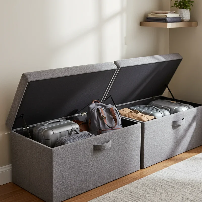 Storage ottomans blend seamlessly into living spaces while providing discreet compartments for smaller luggage and travel essentials. These versatile pieces serve as footrests, extra seating, and coffee tables depending on your current needs. Choose ottomans with removable lids that allow easy access to stored items without struggling with stuck drawers. The soft exterior protects your luggage from scratches while the enclosed design keeps dust and pet hair away. Position storage ottomans strategically in entryways, bedrooms, or family rooms where they enhance both function and aesthetics. Many models feature tufted tops or decorative fabrics that elevate your interior design rather than detracting from it. This solution works particularly well for frequently used bags like gym totes or weekend duffel bags that need quick accessibility. You get beautiful furniture that secretly solves your storage challenges.
