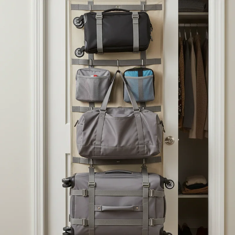 That narrow space behind doors offers surprisingly useful storage potential that costs almost nothing to implement effectively. Install heavy-duty hooks or over-the-door organizers that can support the weight of backpacks and lightweight duffel bags. You can hang multiple bags on a single multi-hook system, maximizing every available inch of space. This approach works particularly well for frequently used items like gym bags, laptop backpacks, or weekend getaway totes. Make sure the door can still open and close properly without the bags interfering with the swing. Behind-door storage keeps your luggage immediately accessible while maintaining a clutter-free appearance in main living areas. It's one of those simple solutions that makes you wonder why you didn't think of it sooner.
