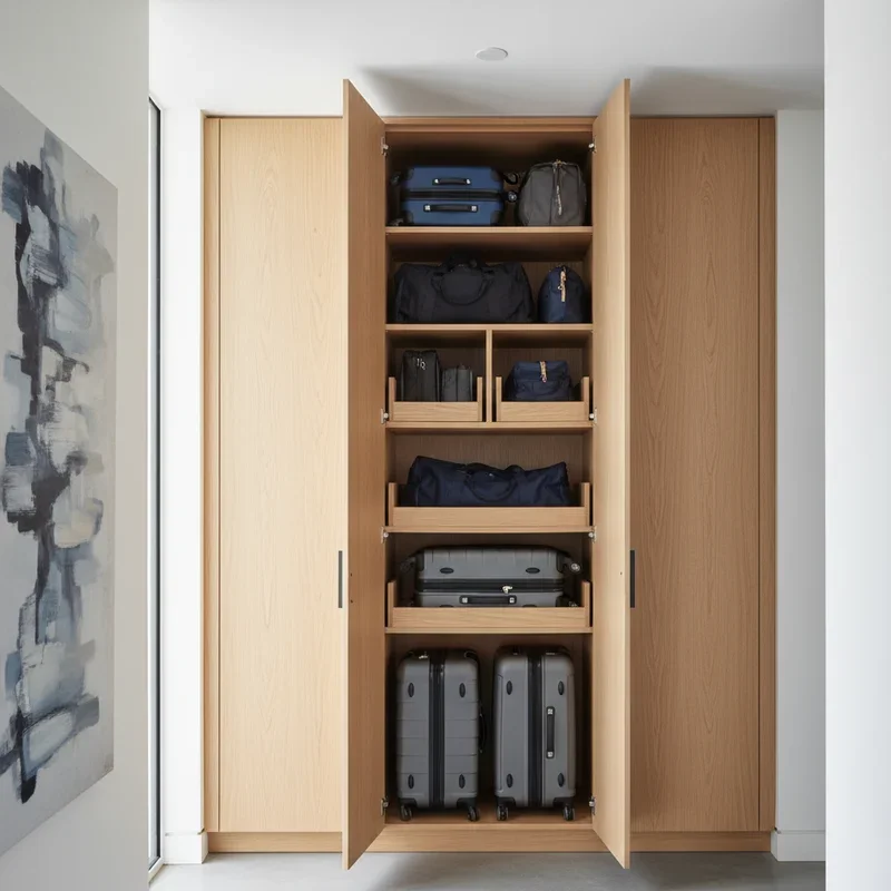 Custom built-in cabinets represent a more permanent investment that adds both storage capacity and home value simultaneously. Work with a contractor or skilled carpenter to design cabinets specifically dimensioned for your luggage collection. These installations can fill awkward spaces like areas under staircases, alcoves, or unused corners that standard furniture can't accommodate. Include adjustable shelving inside so you can modify configurations as your luggage needs evolve over time. Built-ins create a polished, intentional appearance that makes storage feel like a deliberate design choice rather than an afterthought. While this option costs more upfront than simple shelving, it provides long-term organization that withstands daily use. Consider adding doors to keep luggage completely hidden and protected from dust accumulation.