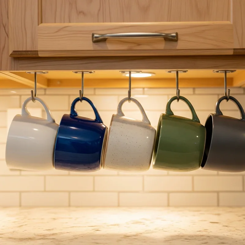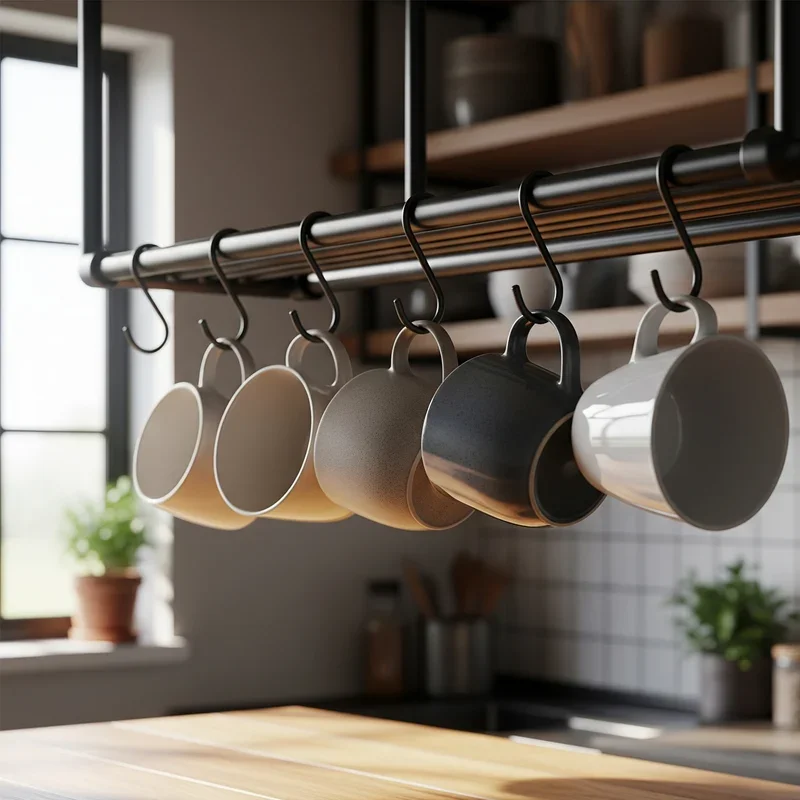 Look up for innovative storage solutions! Ceiling-mounted rails or pot racks aren't just for cookware anymore. Install a decorative rail system above your kitchen island or coffee station to create overhead mug storage that's both functional and eye-catching. This approach works especially well in kitchens with high ceilings where vertical space often goes unused. Choose from wrought iron, copper, or stainless steel rails that complement your kitchen's style. Add S-hooks at regular intervals to hang mugs by their handles, creating an artistic display that frees up valuable cabinet and counter space. The hanging mugs become part of your kitchen's decor, adding visual interest while remaining easily accessible for daily use.